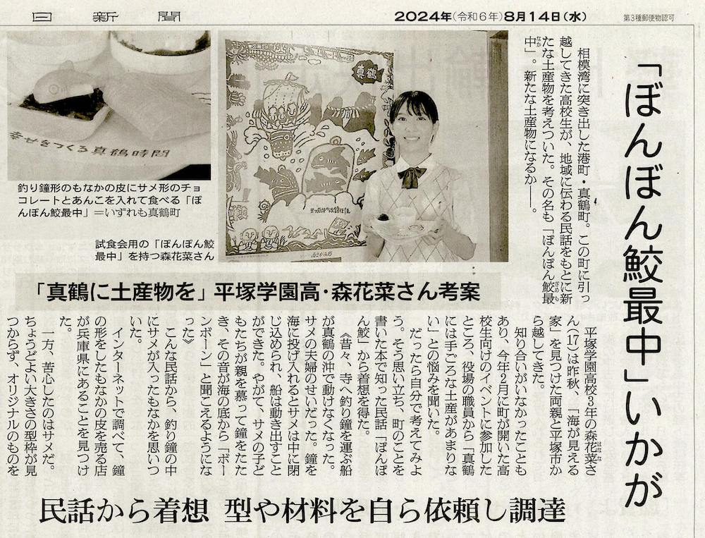 町に伝わる「暴れ鮫をお寺の鐘に閉じ込めた」昔話から着想を得たお土産を開発中です。鐘の形をしたモナカに、アンコと鮫のチョコレートを入れるお菓子で、観光協会や商工会青年部の協力も得て、最も大きな活動として取り組んでいます。