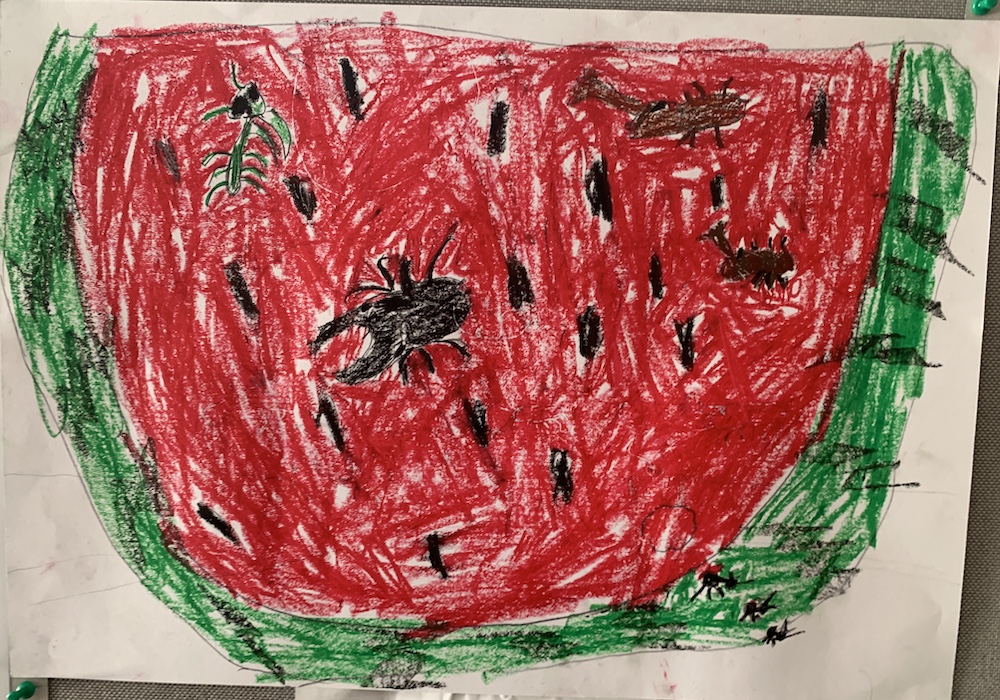 ぼくは虫がにがてだけど、スイカによってくる虫はカブトムシとかクワガタとか、かっこいい虫がきてくれるのですきになりました。