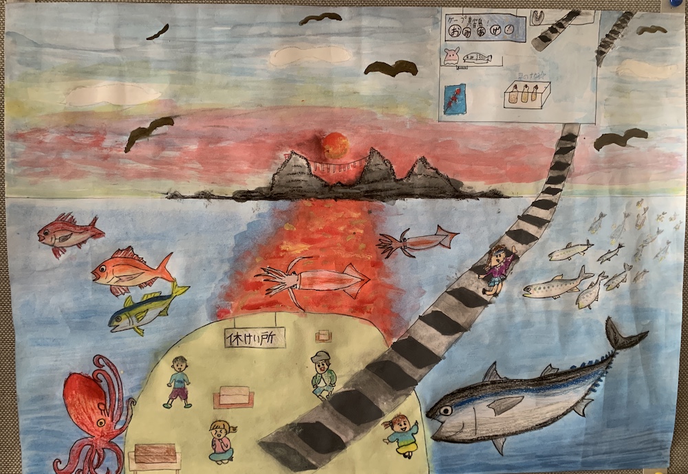 私はまなづるの海が大好きです。そのきれいな海をいかして「水族館ができたらいいな〜」と思い、絵にかいてみました。三ツ石のかいだんがエレベーターになって、海までつながっていて、そのまま海中にガラスのへやがあって、そこからまなづるの海をみわたせて、たくさんの魚や三ツ石の朝日もみえたら「さいこうだなー」と思い、えがいてみました。