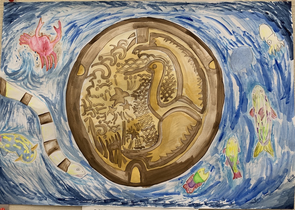 まなづるのマンホールのかっこよさを知ってほしい。マンホールのまわりをコンクリートにしないで、ぼくの好きな海をかきました。