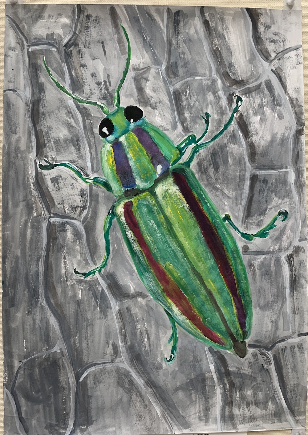 私は、お林展望公園にある、うろこのような松の木についていた、ある宝石の絵をかきました。ある宝石とは「玉虫」です。玉虫はとてもキレイな色をしている虫です。本当に宝石のような虫です。私がこの絵で一番がんばったところは、玉虫はきほんてきにかがやいているので、黄色の絵の具などでかがやきを出しました。