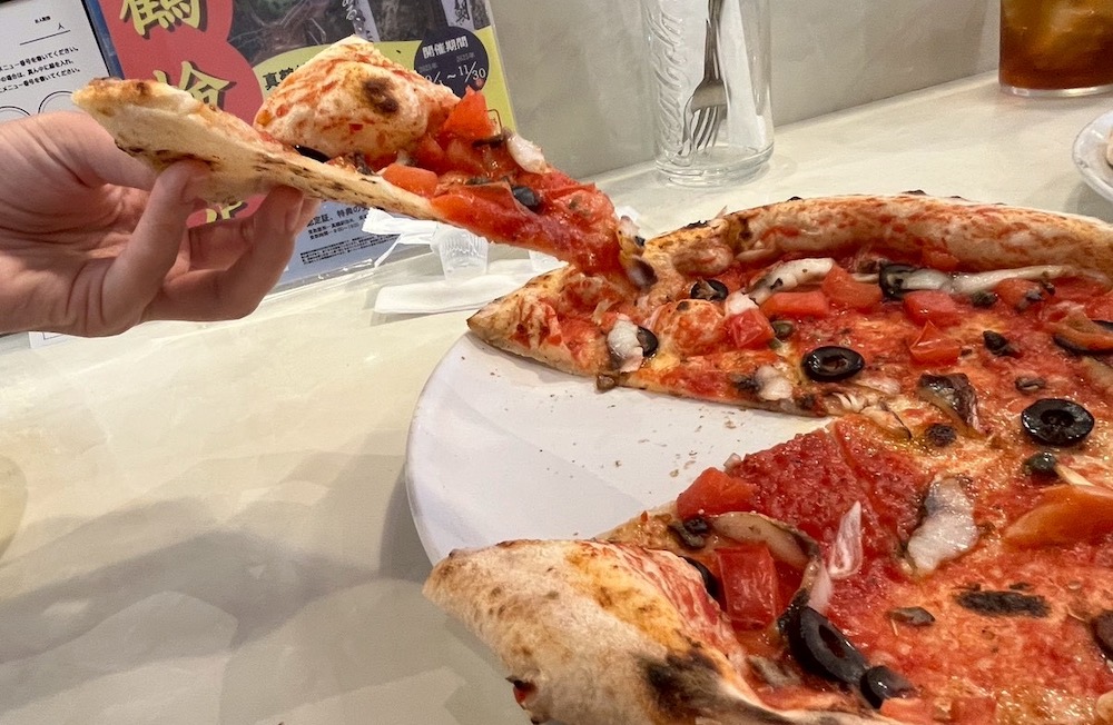 違いは生地!! ロゴや看板でもまあるいピザ生地が♾マークのように舞っています。都内でイタリアンの修行をされてきた研介さんの焼くピザは、やや薄めのクリスピータイプなのに、もちもちっとしたところがちゃんとあって……。