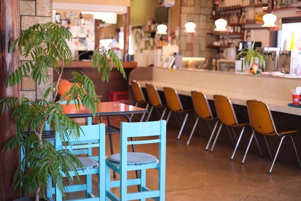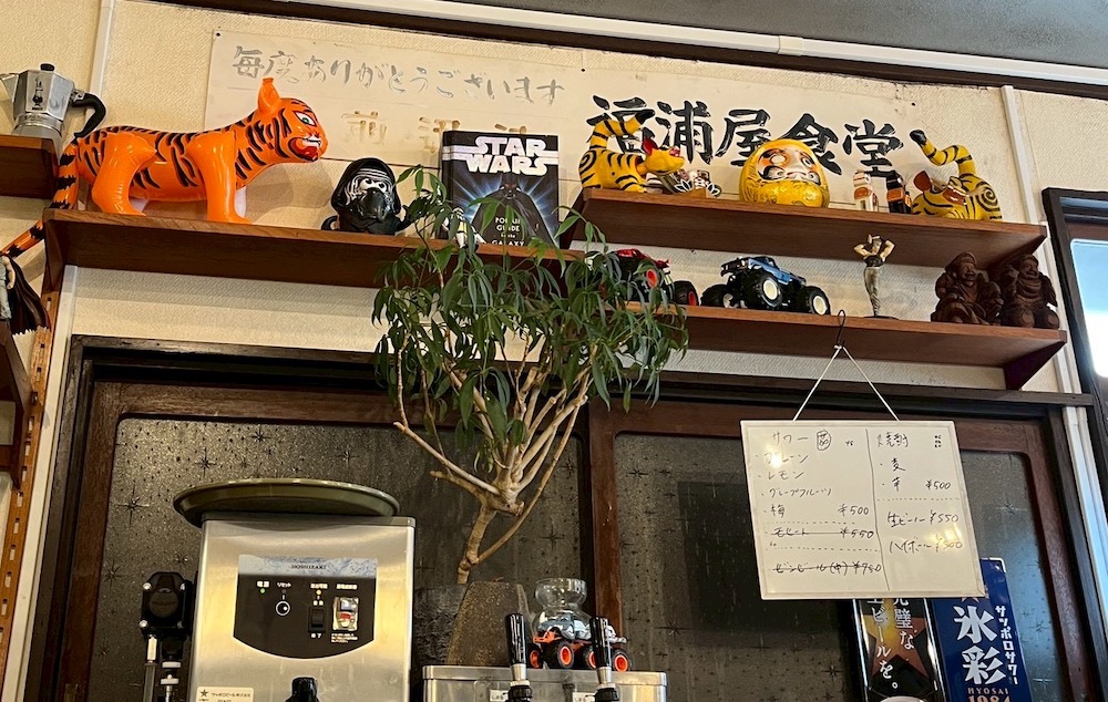 元々は「福浦屋食堂」というお店だったレトロな店内には、アメリカンな映画のキャラクター、Tシャツやマグカップなどオリジナルの虎ちゃんグッズ、本棚にはフリーダイビングの書籍、2階は本格的なダーツBAR……。