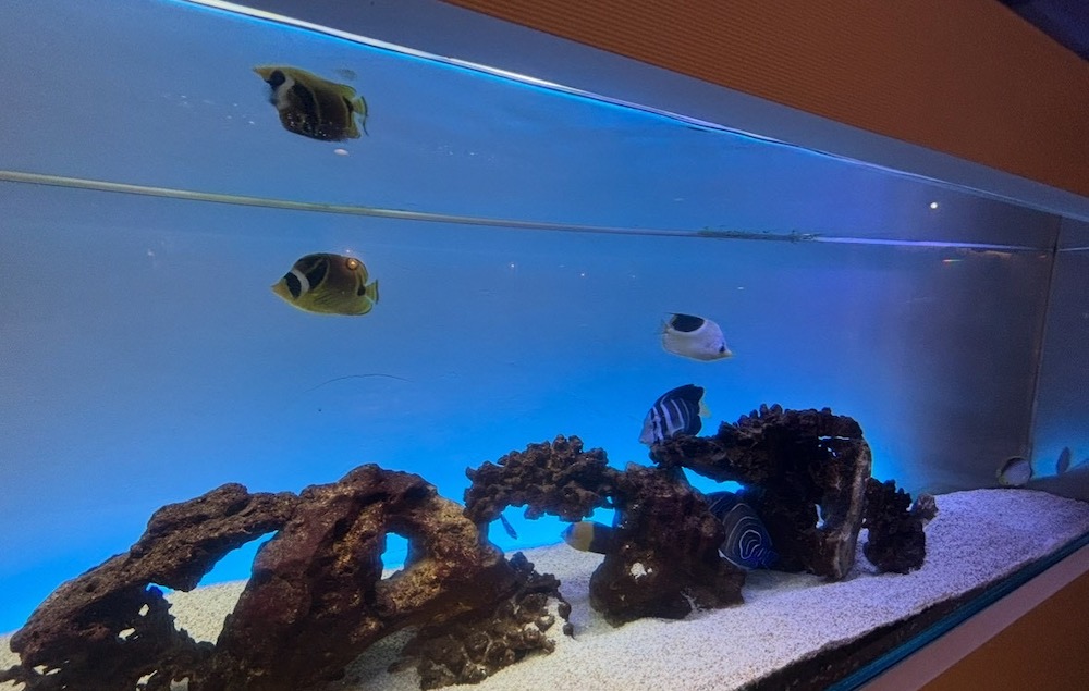 ぜひお店の中に入って、見てみてください。この水槽の中を優雅に泳いでいるのは、なんと真鶴の海で採集されたチョウチョウウオやヤッコといった種類の、色鮮やかな熱帯魚たちなんです!!