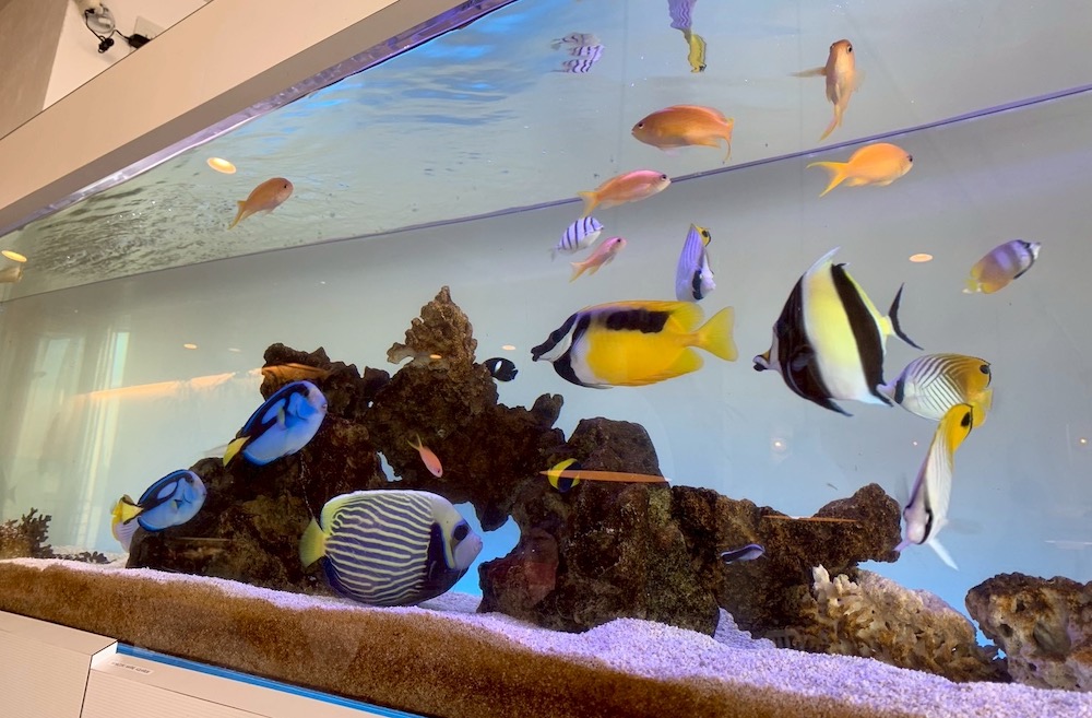 お店の前を歩いていると、まず目に飛び込んでくるのがドーンと置かれた大きな水槽! でも「わぁ、美味しそうなお魚!!」……なんて眺めるお寿司屋さんの水槽とは違います。