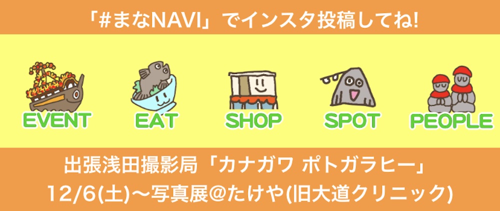 ここのところずーっと、『まなNAVI』トップページのインスタグラム下に表示してある文字「出張浅田撮影局『カナガワ ポトガラヒー』12/6(土)〜写真展@たけや(旧大道クリニック)」……ご覧いただいてるでしょうか?