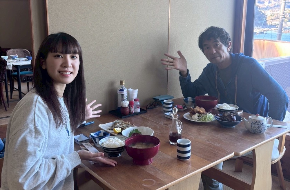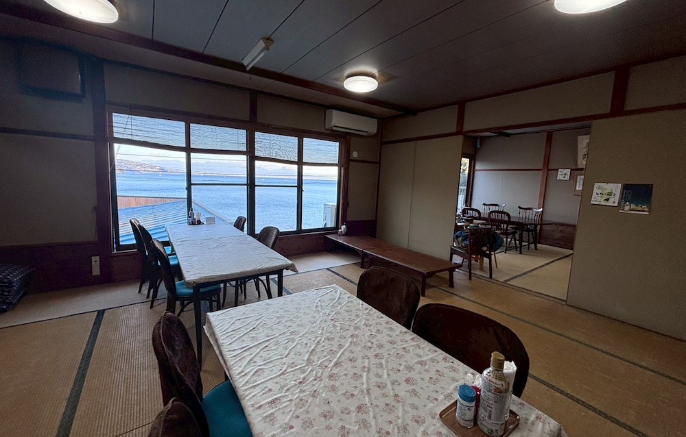 見てください! この景色!! お天気が良かったせいもあって、見慣れているはずの琴ヶ浜なのにちょっとカンドー! 先行されていた2人連れのお客さんも、窓際の席に陣取って、穏やかな海と真鶴時間を楽しんでいらっしゃいました。