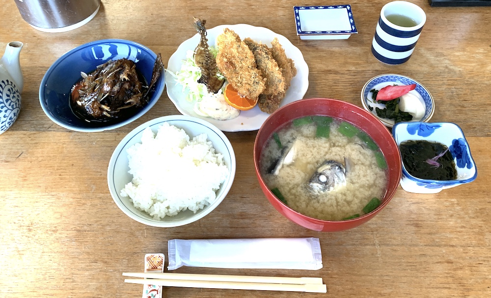 「日替わり定食はお刺身ですよ」と言われていたのに焼き魚が付いてきました。「アジフライ定食」にもなぜか煮魚が付いてきました。そして両方にアラ汁、しかも「アジのアラ汁」という、身もたっぷり付いている、初体験のアラ汁でした!!