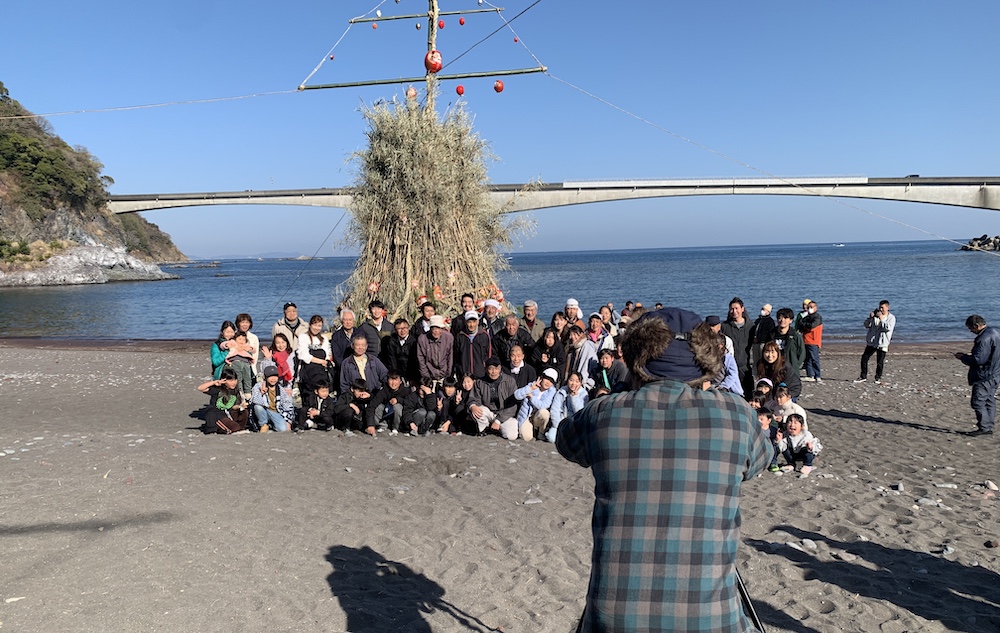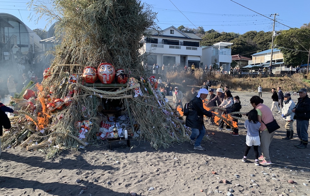 点火予定の1時30分の少し前に海岸に着くと、すでにたくさんの人が集まっていて、子どもたちが楽しそうに砂浜を駆け回っています。大人たちは記念撮影をして、お塩や御神酒でお清めをして……と着々と準備を進めています。
