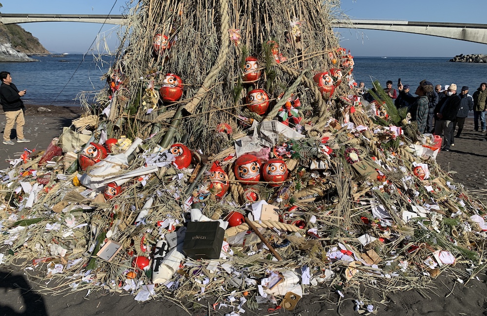 強風により延期になったため、2週のあいだ待つことになりました。岩海岸で開催されるドンド焼き。まだ松の内だった1月4日の日曜日に『準備に行ってきたよ』の記事でお伝えした通り、大きなヤグラを砂浜に立てました。