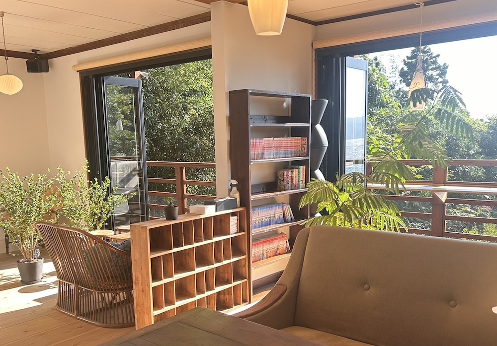 もちろん窓、バルコニーからは海が望めて、センスの良いテーブルやソファなどの調度品に囲まれながら、ゆったりと流れる真鶴時間を味わえます。古い旅館(元「旅館かつら」さん)をリノベするだけで、こーんなに素敵な空間に生まれ変わるなんて、古民家に憧れている私には、とっても参考になりました。