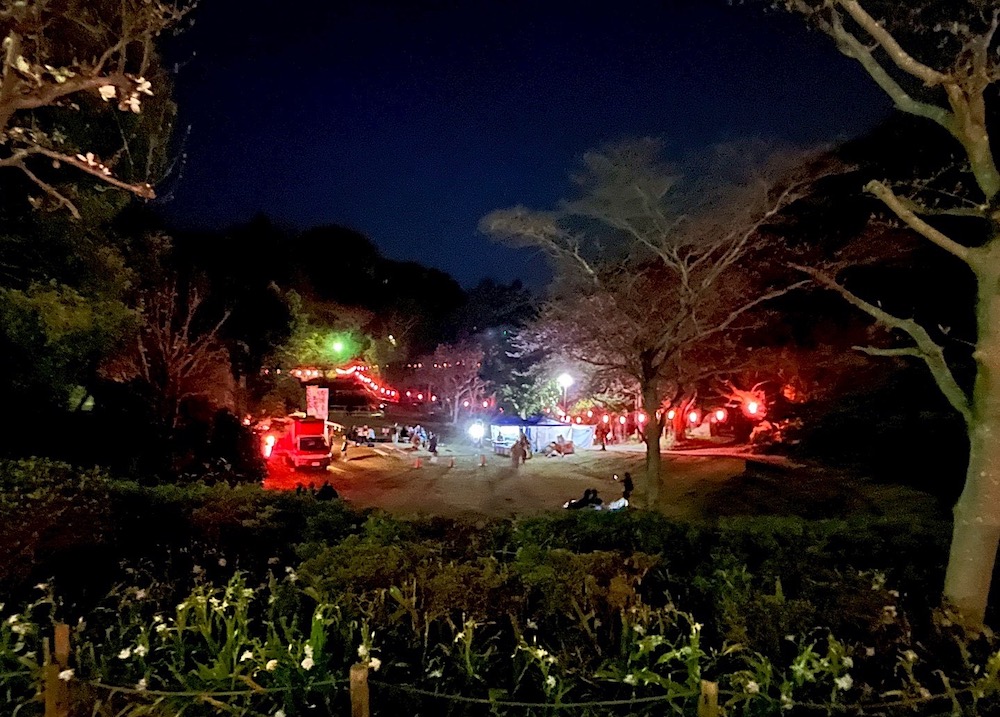 真鶴に来て最初の年、家族で昼間に見に行きました。桜は確かに綺麗ですが「ふーん、夜になるとライトアップもするんだね」といった感想。それから昨年も昼間に見に行ってしまい「しまった、夜にくるべきだったんだ!」という後悔。そして今年。真鶴商工会青年部に入れてもらった私は、朝の8:30から夜の21:00まで、商工会のテントでお手伝いすることになりました。
