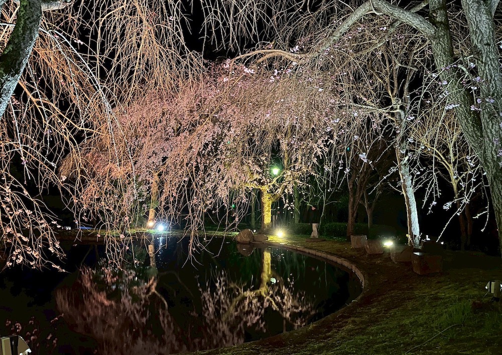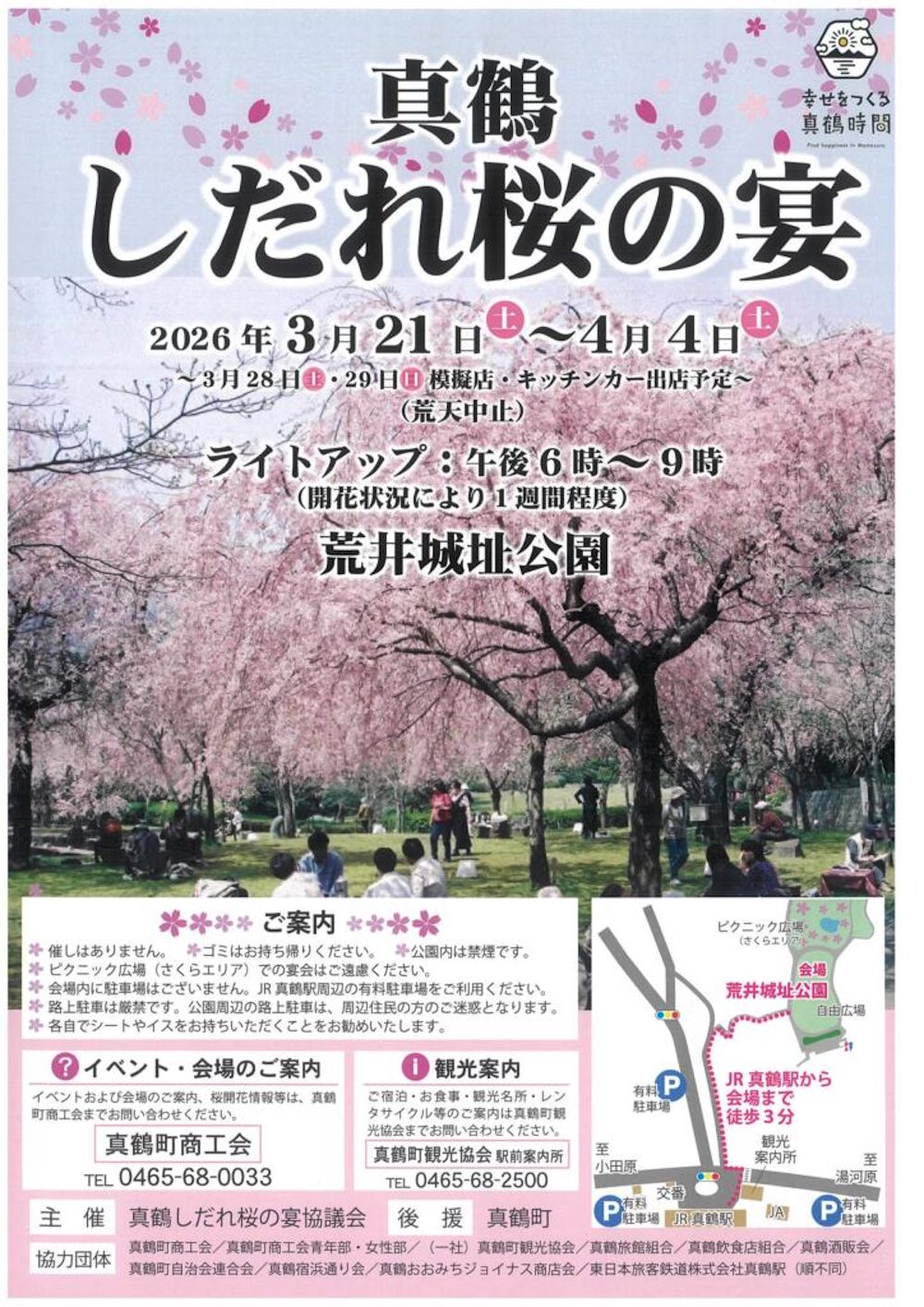 真鶴しだれ桜の宴は「4月4日まで」とポスターに記載されていますが、しだれ桜のライトアップは(開花状況により1週間程度)と断り書きがされています。今年は25日の水曜日から始まったので、もうギリギリ!? 直前の告知になってしまいますが、お勧めです! ぜひ、お足を運びください!!