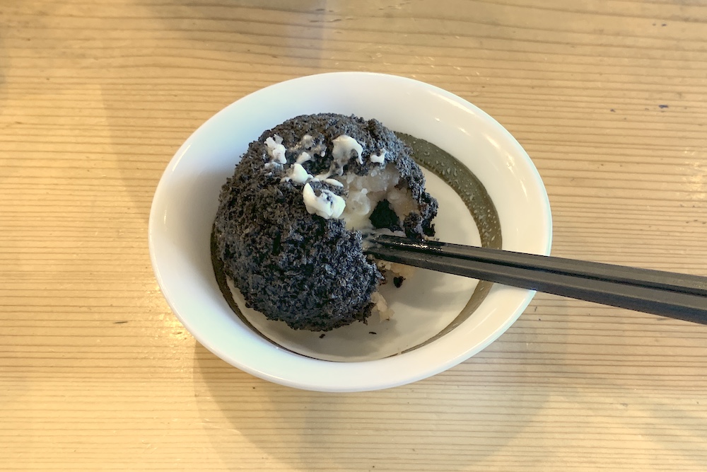 そしてランチの方に是非お試し頂きたいのが、この真っ黒な「イカ爆弾」です!! 『魚伝(UODEN)』さんの青木良磨さんが開発して、国交省の「観光振興賞」も受賞した逸品です!! 黒い色は、イカスミ入りのパン粉で揚げているから。中身はジャガイモとイカと飴色玉ねぎにとろ~りチーズも入ってます!!