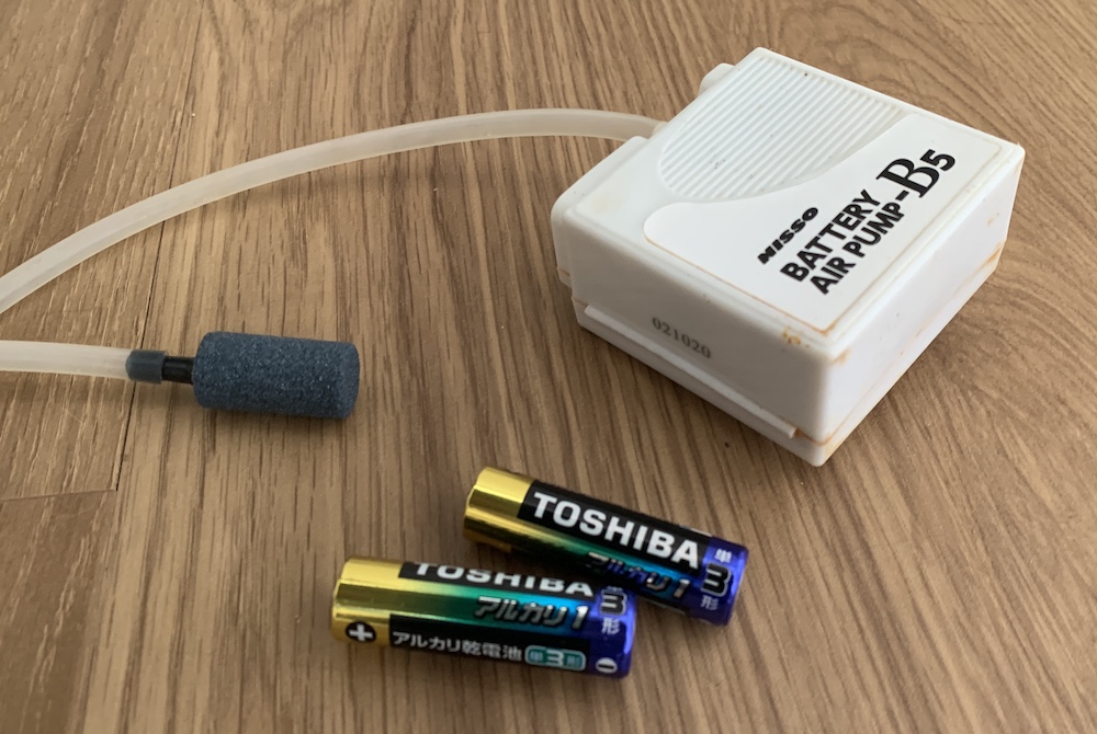 車移動でも、電車移動でも、コンセントが使えませんから、皆さん写真のような電池式のエアーポンプを使用しています。でもこれが結構面倒で、乾電池が切れちゃったりするので予備の電池も持ち運ばなきゃいけなかったり、海水がかかってどうしても中がサビちゃうものなんです。