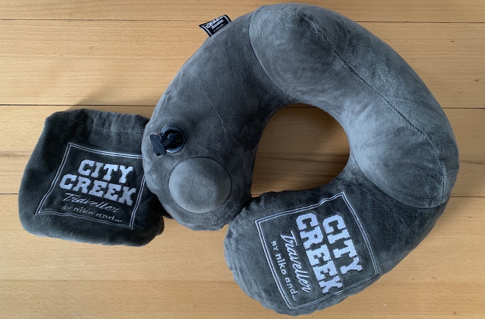 「エアパッキン」を一般家庭や採集先(海)で実行しようと思っても、ボンベを用意するのは大掛かりで非現実的。ところが先述した通り、ウトウトしている時に思い付きました! 前回ご報告したボストン留学へ行く際に。長時間の飛行機移動のため、父からこんなネックピローを借りたのですが……。