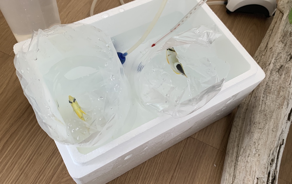 お家の水槽でお魚を飼育する時は、もちろんコンセントからとった電源でエアポンプを駆動させ、毎日24時間ずーっとエアレーションをかけるものなのですが、問題は私のように海で採集した豆チョウをお家まで持ち帰る時です。