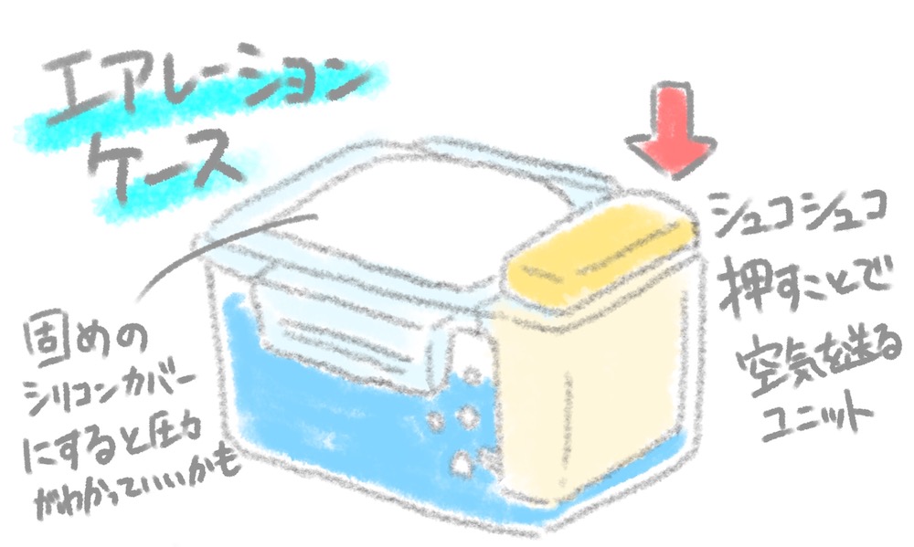 ピッチリとフタが締まる透明容器を用意して、その横にシュコシュコと空気を送り込むポンプを付けるだけです。こうするだけで容器の上段に溜まった空気の圧力を手動で高める事が可能になり、ポンベがなくてもエアパッキンと同様の効果が期待できるはずです。
