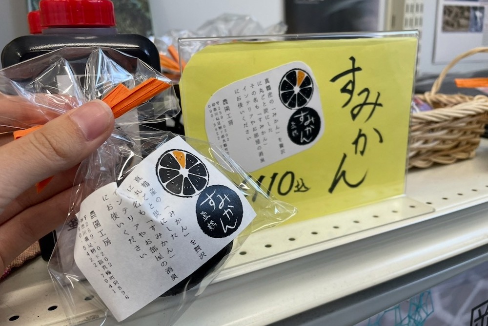 そんなアットホームな『観光協会』さんでは、いろいろな真鶴土産が販売されています。 たとえば、松本農園さんのミカンを使った「アロマオイル」や、消臭用の「みかん炭」。みかん炭は、私が引っ越してきたばかりの頃に「なんだろう……?」と気になって購入したこともありました。