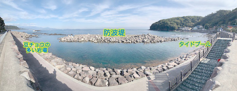 右の方はタイドプールになっていて、小さなお子さんが小魚を捕まえに中を覗いているのをよく見かけます。私はすごい魚がいるかもしれないと思い、海から上がった後によく覗いて見ています。