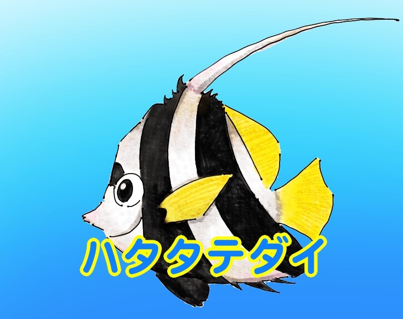 見た目は、白色の体に2本の太い黒い線が走っていて、背びれの後ろの方・胸びれ・尾びれは黄色です。ハタタテダイは泳ぐときにとても長い背びれが優雅にひらひらするのがとても綺麗で好きな魚です。