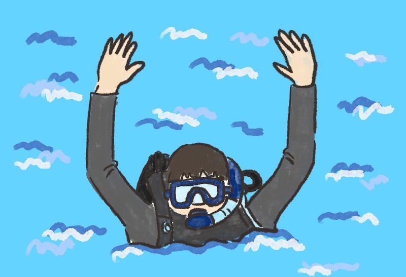私の母はダイビングのライセンスを昔取った時に、ファイナルエグザムにてハンドシグナルの正しい意味を選ぶ問題で、上の非常事態を示している「水面で問題あり」という意味のハンドシグナルを「スノーケルがしたいです!」という脳天気な回答してしまったことが、私の家では”伝説”になっています。