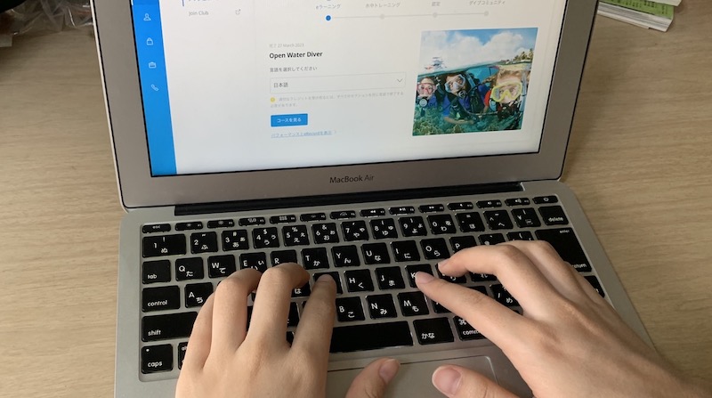 私は学科講習を事前に自宅で受けられる「PADI e-ラーニング」という教材を使いました。e-ラーニングとは、宮古島へ旅立つ二週間前に教材が届き、インターネットで学科試験まで受けることができる方法です。