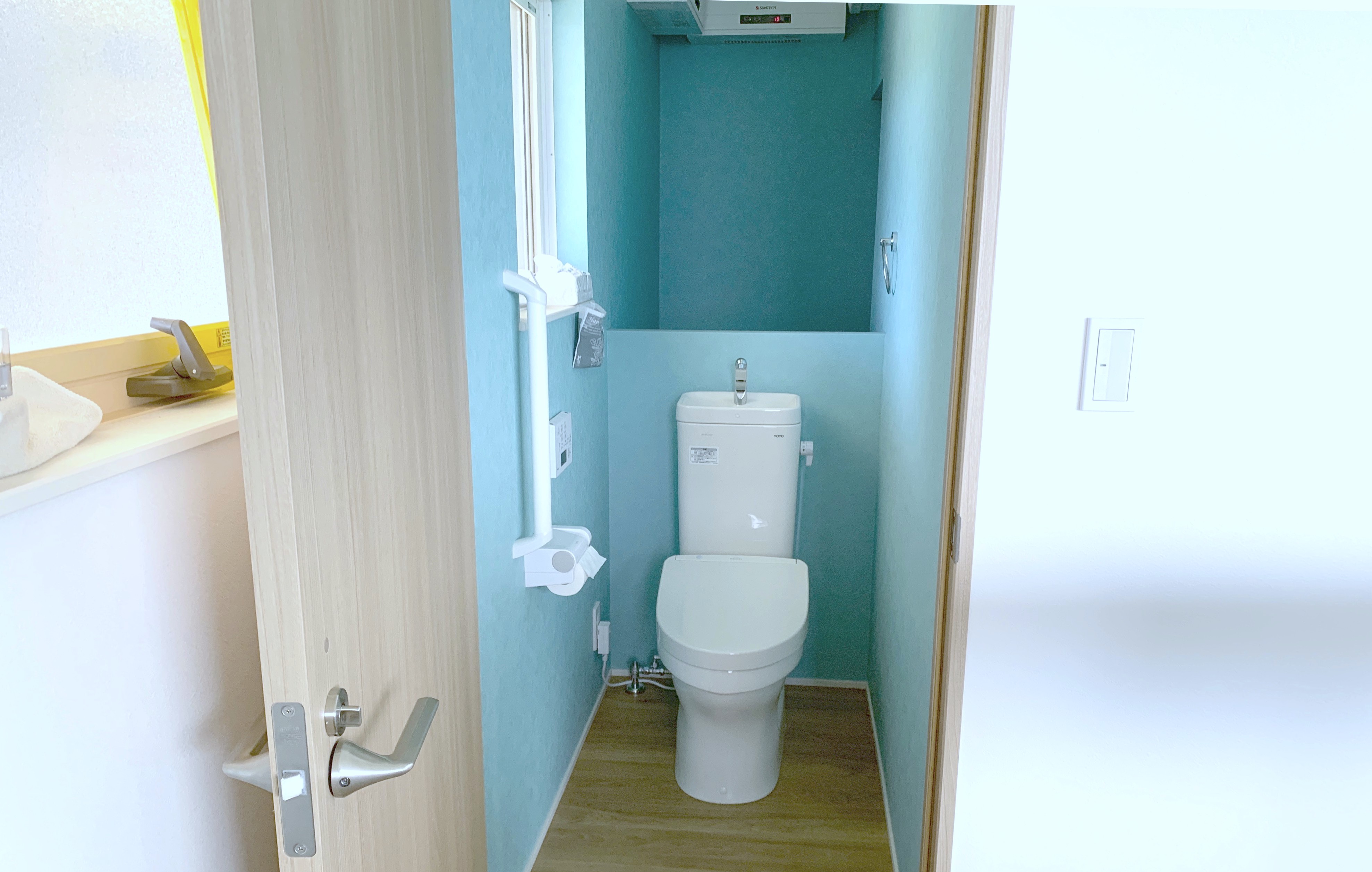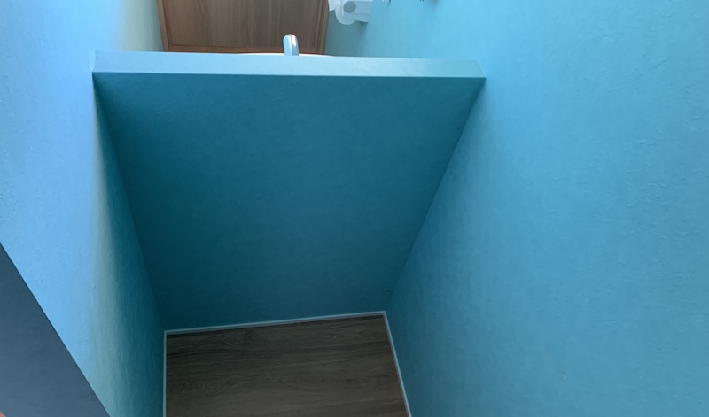 水槽を置くために、トイレの個室が普通のお家とはちょこっと変わった作りになっています。なんと、写真のようにトイレの後ろに少しスペースがあります。「これじゃあトイレを後ろから覗き放題!?」と思ってしまいますが、カーテンと水槽をしっかりと置くので問題はありません!
