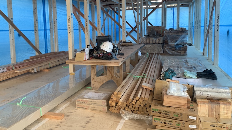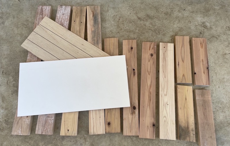 水槽台は自作する人が多いので、私も自分で1から作ります! 材料の木材は、新しい家を建てているときに、大工さんが『焚き火用に』と倉庫に置いていってくれた端材から選んで使います。DIYは不慣れですが、お父さんに色々なアドバイスをもらって頑張って作っていきます。