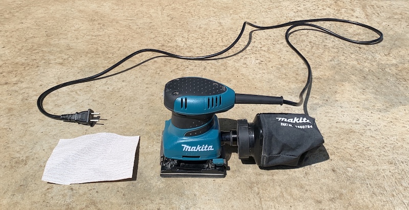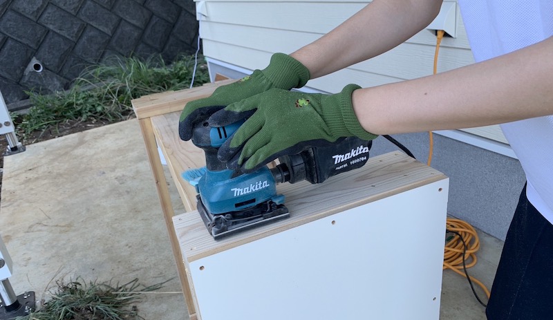 組み立てているときの歪みで、出来上がった水槽台がトイレの幅よりほんの少し大きくなってしまいました。トイレに入りません。そこで、削って横幅を丁度良くするために「ブラックサンダー」……ではなく「電動サンダー」を使いました。以前からなぜか、母が「電動サンダーが欲しい!」と言っていたこともあり、この水槽台を作るために買ってもらった新品ホヤホヤです。