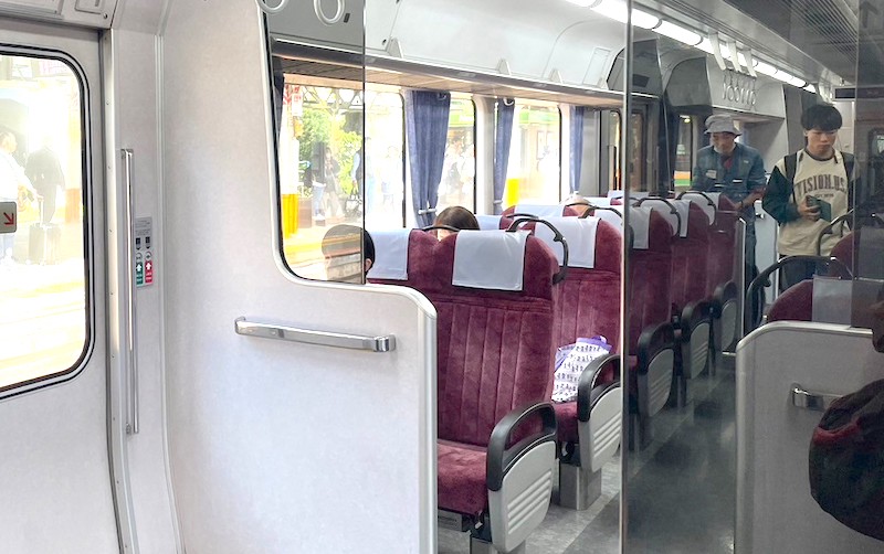 真鶴駅を出発して、三島駅まで電車で向かいます。その途中で乗りかえることになった電車が、ちょっとレトロな雰囲気で素敵でした。昔の特急列車のようで、小旅行しているような気分に! 通常料金でこんな電車に乗れるとは思わなかったです
