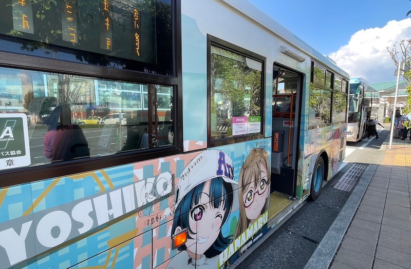 三島駅のバスロータリーに出て、『幼魚水族館』へ向かうために停留所でバスを待っていると、私の大好きなアニメ「ラブライブサンシャイン」のAqoursのラッピングバスがやって来ました。以前から乗ってみたいなぁと思っていたので、とても嬉しかったです。