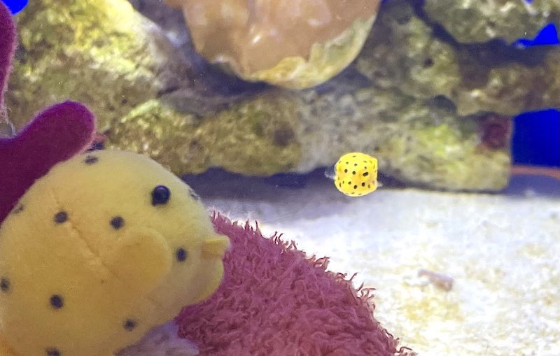 お家から持ってきたぬいぐるみと撮りました。ミナミハコフグのつぶらな瞳がかわいい♡