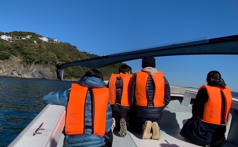 実習船「たちばな」が停泊している「岩港」まで歩いて移動しました。船に乗る前に堤防の上から海の中を覗いていると、トゲチョウチョウウオが泳いでました。網を持ってくれば豆チョウ採集もできたかも!? と思いながら船に乗り込みました。