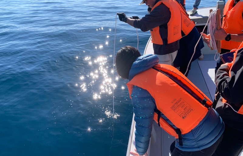 沖に出て水深が約100メートルある地点に到着すると、海洋調査を開始しました。ロープを括りつけた白い円盤を海中にゆっくりと沈めて、その円盤が見えなくなるまでの水位を測ります。