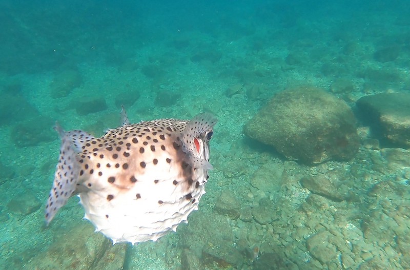チョウチョウウオもホンソメワケベラも採ることができず、寒くなってきたので海から上がることにしました。岸へ向かっている途中に父がイシガキフグを採りました。大きなフグで、膨らむと目が真ん丸なこともあってとってもかわいかったです。