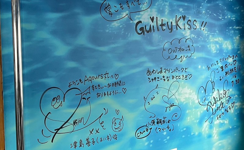船内に入ると声優さんのサインが至るところにあり、それを見つけるだけでも楽しいです。淡島までは片道3分ほどなので「あっ」という間の船旅ですが、この日は天気も良くてデッキからの内浦の海の景色は最高でした!!
