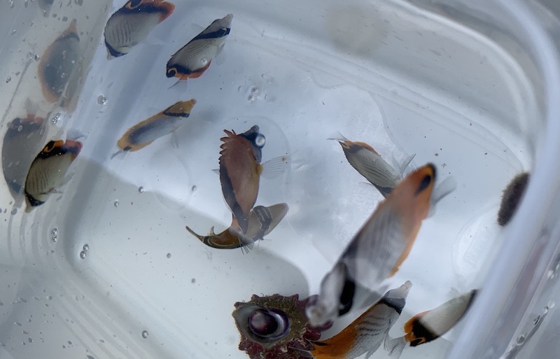 この連載のメインは「チョウチョウウオの赤ちゃん採集」……私が呼ぶところの「豆チョウ採集」です。でも水温が低くなる冬は豆チョウ自体が海にいないんですよね。黒潮で流されてきた熱帯の(沖縄の)魚なので、可哀想な事に死んでしまうんです。