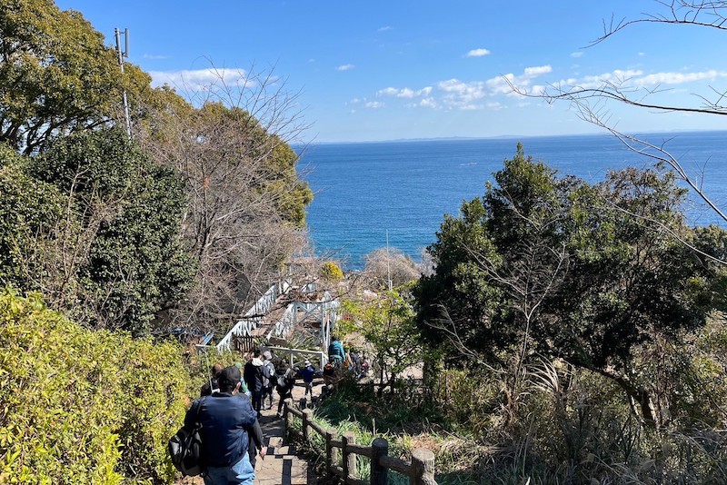 集まったのは約15人ほど。小学生くらいのお子さん連れが多く、中には、私が以前住んでいた平塚から参加しているご家族もいてびっくり! 集合場所の「遠藤貝類博物館」から三ツ石海岸までは歩いて移動です。200段以上もある階段を降りるので大変!!