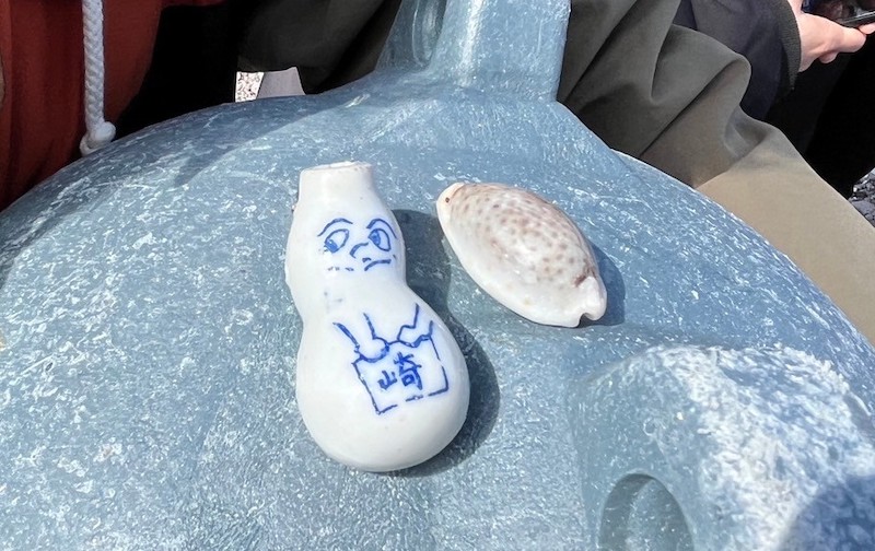 お勉強的なマイクロプラスチック集めが終わると、いよいよ本当の「ビーチコーミング」がスタート! 私が「タカラガイ」のような綺麗な貝を探していると、どこかで見覚えのあるものが!! ……横浜「崎陽軒」の醤油入れ、「ひょうちゃん」を見つけました!!