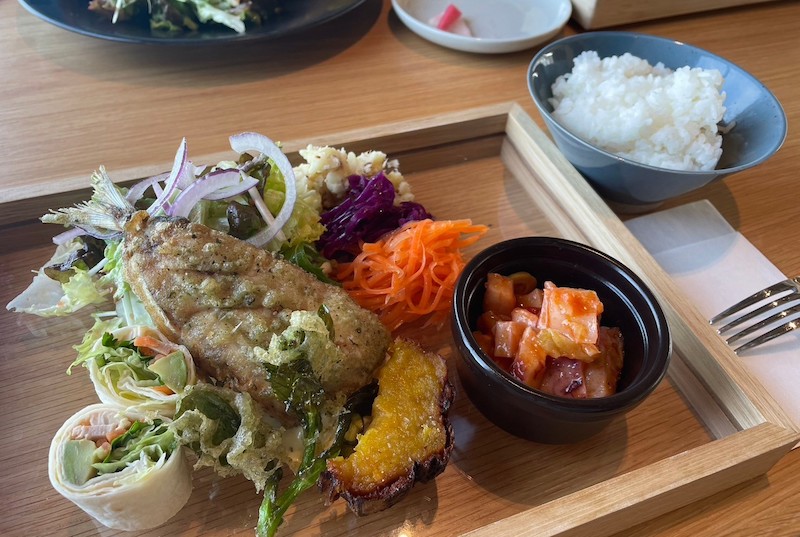 レストランからもホテルの部屋からも真鶴の綺麗な街並みと太陽の光で煌めく海が見え、最高の景色を味わえます。そして、真鶴の野菜と魚がたっぷり使われている『真鶴ローカルプラッター』で、私は眼もお腹も満たされちゃいました!!