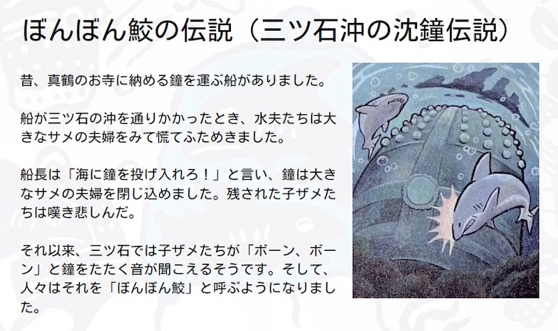 ここで、今回のお菓子の元になる真鶴の昔話を紹介します。真鶴半島の先端にある景勝地「三ツ石」海岸に伝わるお話で、地元では「ぼんぼんザメ」とか「三ツ石の沈鐘伝説」などと呼ばれているお話です。
