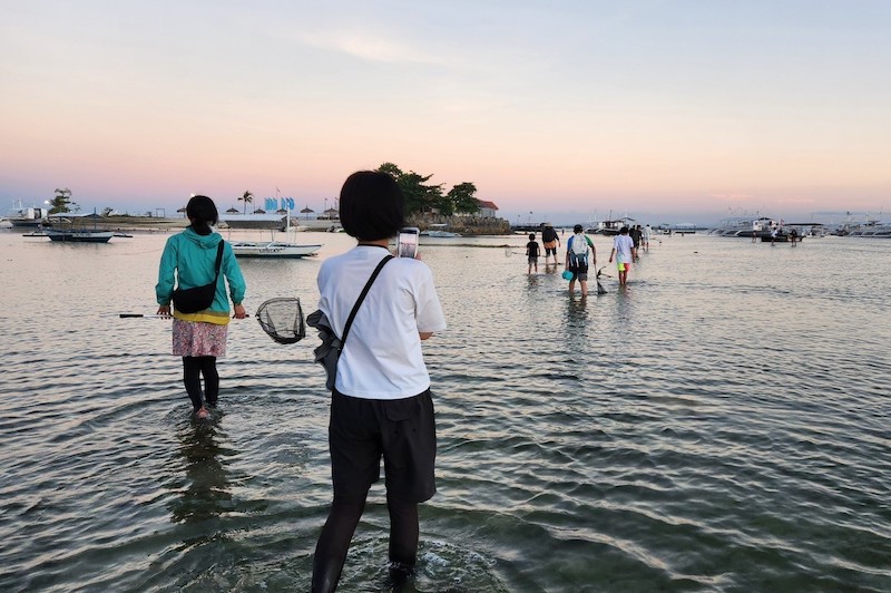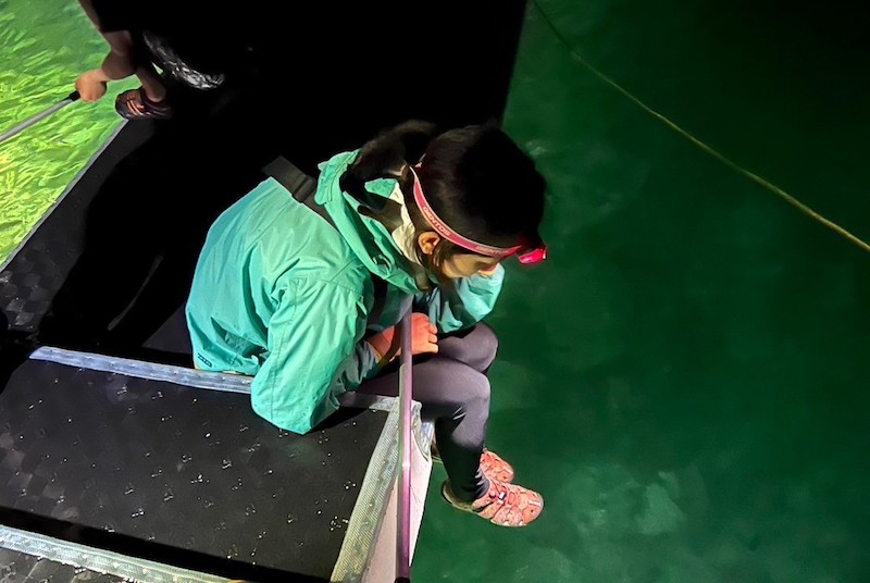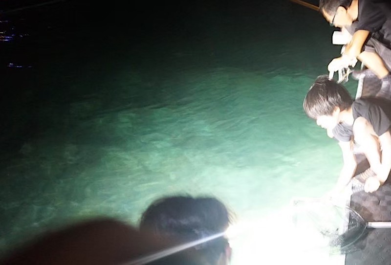 2日目のクライマックスは夜の採集でした。夜はお魚さんたちが眠っていて泳ぎが遅くなるので、採集しやすいと言われます。私自身も、国内で夜の採集をしたことは数回ありますが……あまり採れませんでした。