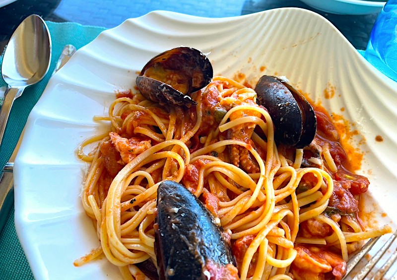 4日間滞在した「Jパークホテル」の中にあるシーフードレストランです。セブ島のとても綺麗な海を見ながら美味しいご飯を食べることが出来ます。私が頼んだのはトマトとチーズのシーフードスパゲティ。