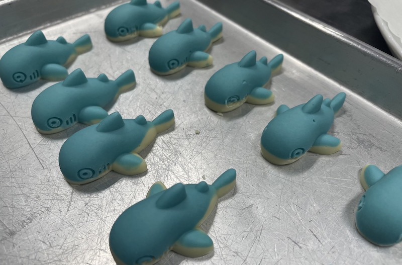 そして、できあがったサメのチョコレートがこちらです!! 白と水色の二色なので夏らしい涼しさのあるチョコレートになりました。こうしてたくさん並べてみると、とってもかわいい!!