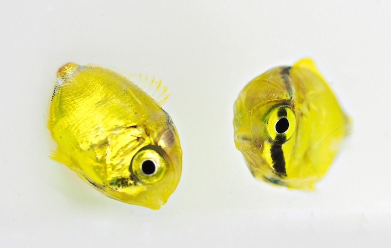 私が狙うのはもちろんチョウチョウウオの赤ちゃん、豆チョウちゃん! いつも網で掬っているのは1円玉や10円玉サイズ。でも、集魚灯で採れるのはもっと小さい数ミリの極小サイズだと言います。