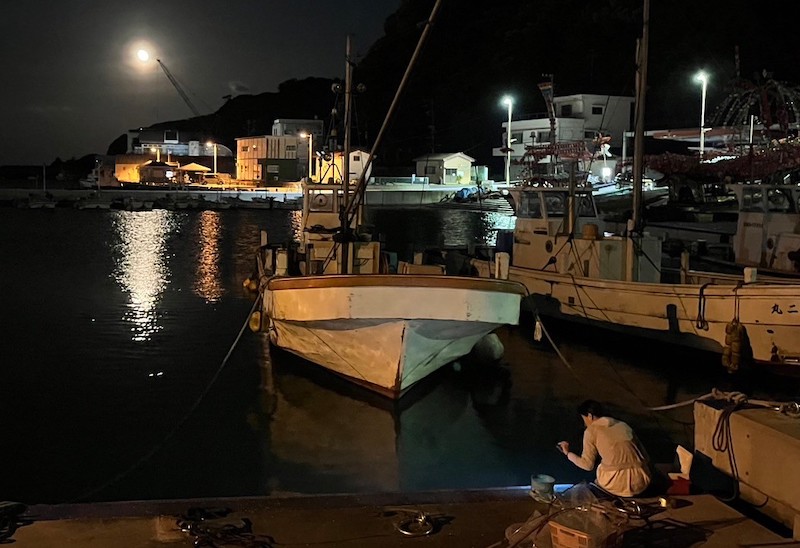 「東洋のリヴィエラ」とも呼ばれる真鶴町は、漁港を囲むようにすり鉢状の街並みが広がっています。夜になると家々の灯りが水面を照らし、幻想的な風景が浮かび上がります。集魚灯で採集する場所はそんな漁港の一角。