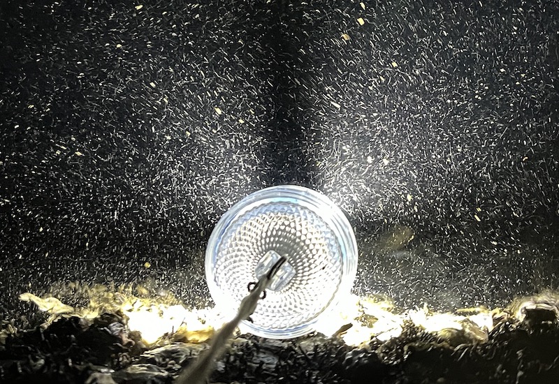 集魚灯を海中に入れると最初は小さなプランクトンが集まってきます。走光性と呼ばれる性質です。次にそれを捕食する極小のエビやタコ、透明な魚、ニョロニョロ動く謎の生物やクラゲなどが集まってきます。