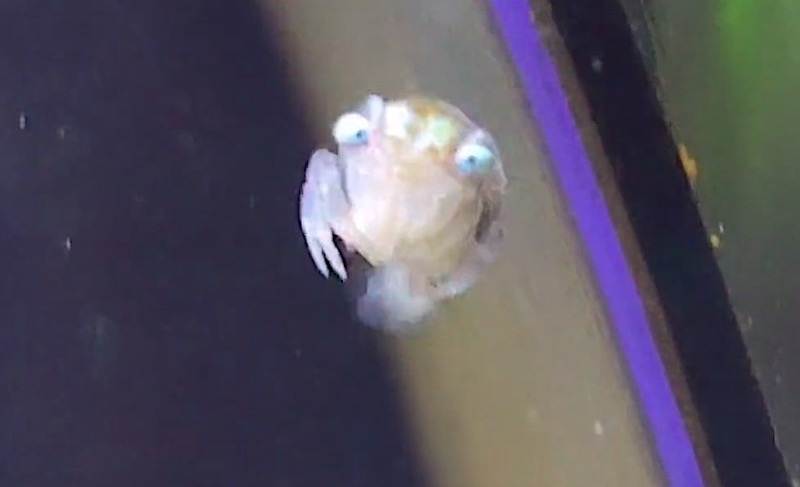 正解はショウジンガニのメガロパ幼生。メガロパとはカニが浮遊生活を終えて底生生活に移るまでの形態。特にショウジンガニは足を折り曲げて、腹節と呼ばれるエビのような腹部を器用に動かして泳ぎます。