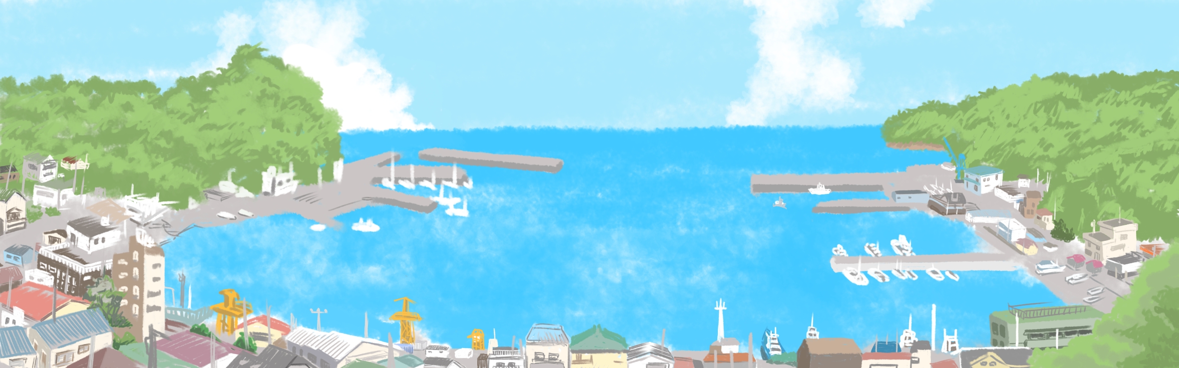 本サイトTOP画像には、町から臨んだ港の風景を掲載しました。そこにアニメーションで「貴船」や「三ツ石」、「道祖神」や「ぼんぼん鮫」などが飛び出すのですが、ご覧のとおり小さいながらに魅力のギュッと詰まった町になります!!